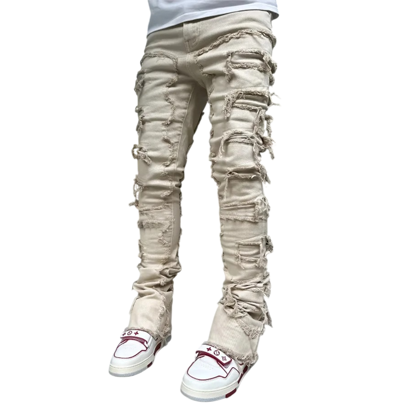 Herrens slitna enfärgade jeans med fickor, denim, modern stil för vardagligt bruk Herrens slitna enfärgade jeans i denim är ett utmärkt val för vardagligt bruk som kombinerar modern stil med komfort. Dessa jeans har en unik design med slitna detaljer, vilket ger dem ett trendigt utseende. Tillverkade av högkvalitativ denim, är de tillräckligt hållbara och samtidigt bekväma för långvarig användning. Praktiska fickor möjliggör bekväm förvaring av småsaker, vilket gör dem idealiska för dagligt bruk. Denna modell är perfekt för dem som vill se stiliga ut och samtidigt känna sig bekväma.