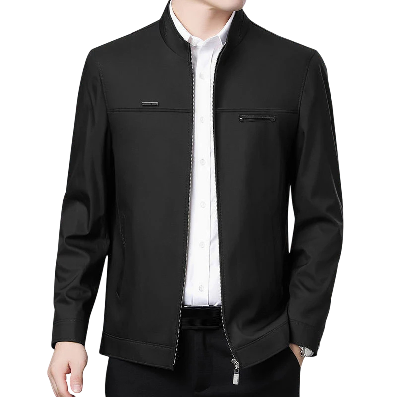 Snygg herrjacka med ståkrage och dragkedja, lämplig för vår och höst. Den kombinerar elegans med komfort, perfekt för både formella och vardagliga kläder. Fullständig beskrivning