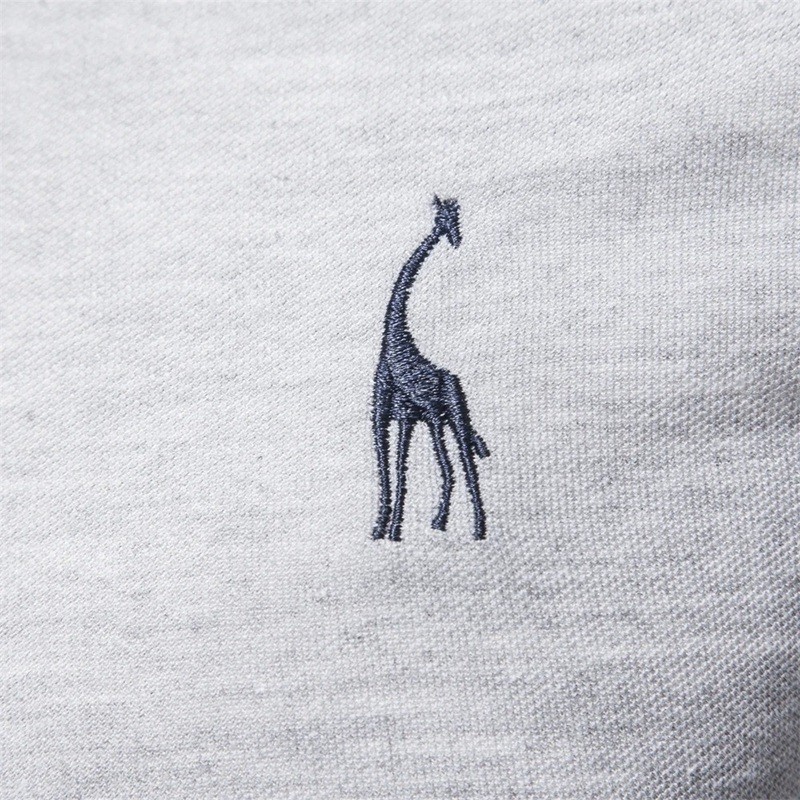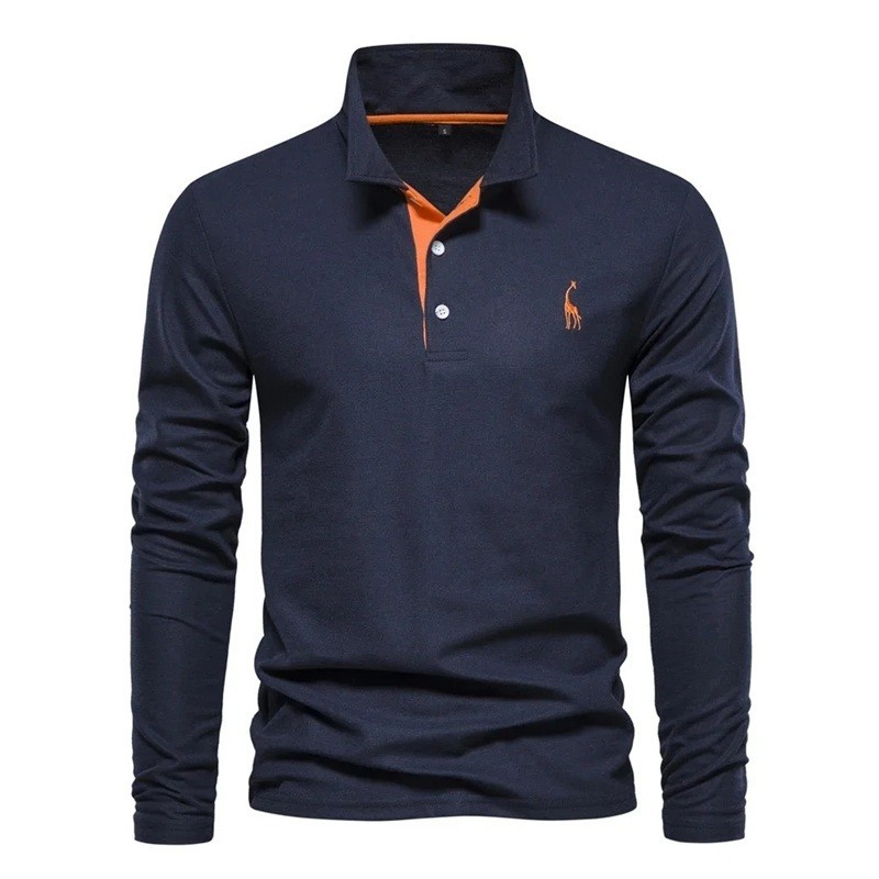 Stilren herrpolotröja med lång ärm, krage och ett subtilt giraffmönster på bröstet, lämplig för vardagsbruk. Fullständig beskrivning