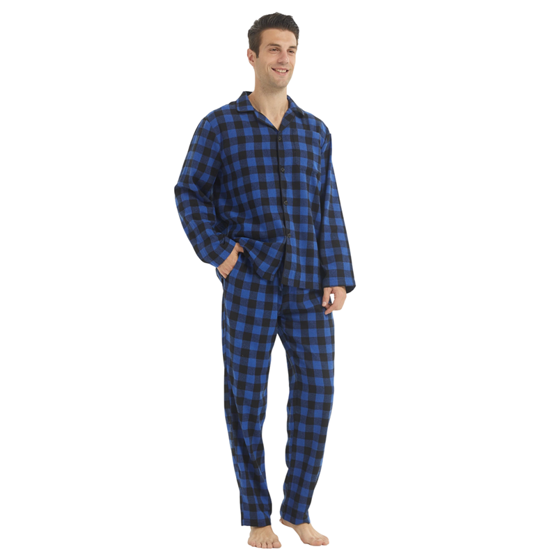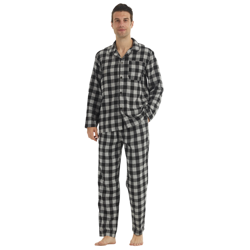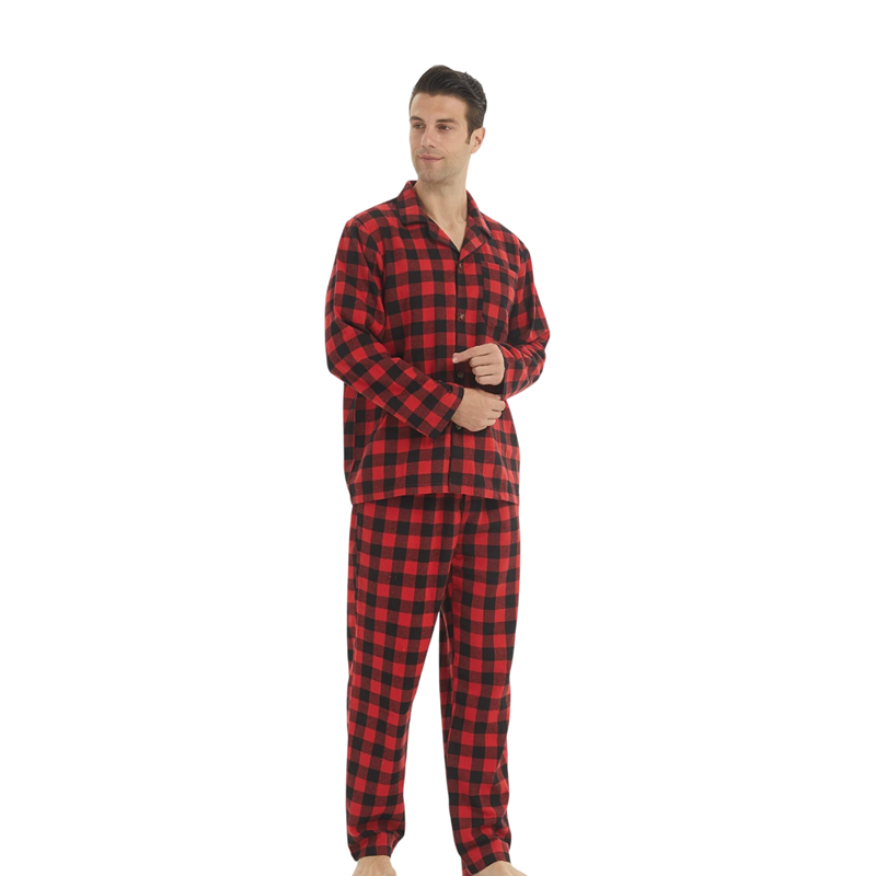 Klassisk herrpyjamaskomplett med krage, knappar och rutigt mönster tillverkat av en kombination av bomull och polyester för bekväm användning hemma. Fullständig beskrivning