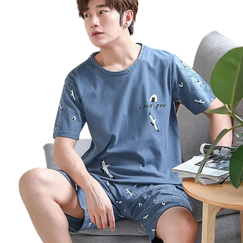 Lätt herr sommarkomplett med shorts och t-shirt med tryck av måsar och text, bekvämt material lämpligt för sömn och hemmakvällar. Fullständig beskrivning