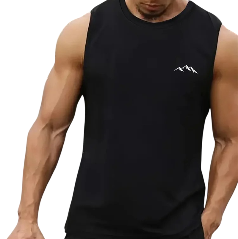 Lätt herrtopp i polyester med bergmotiv erbjuder andningsförmåga, snabb torkning och komfort för sommardagar och aktiv användning. Fullständig beskrivning