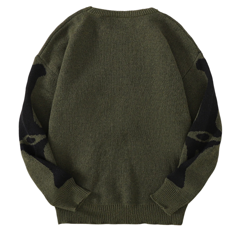 Materialet av högkvalitativ polyester säkerställer hållbarhet, komfort och enkel skötsel. Tröjan är mjuk, behaglig mot huden och behåller sin form även vid långvarig användning tack vare den fasta stickningen. Den enfärgade basen i kombination med det iögonfallande skelettmönstret utgör en idealisk kombination av klassisk stil och modern design. Denna tröja är det perfekta valet för män som vill uttrycka sin personliga stil.