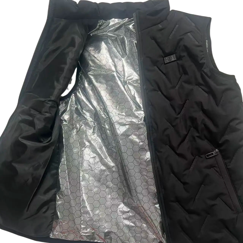 Inuti västen finns uppvärmningskuddar som är strategiskt placerade på olika delar av kroppen. Detta system möjliggör uppvärmning av flera områden samtidigt och bidrar till en jämn fördelning av värmen under användning.