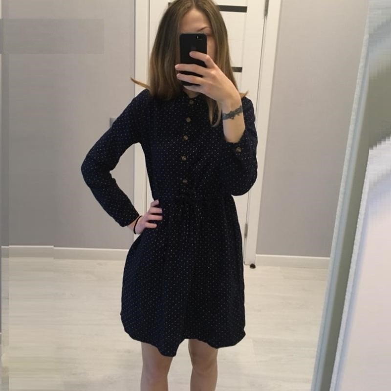 Söt prickig klänning med långa ärmar och skjortkrage.
