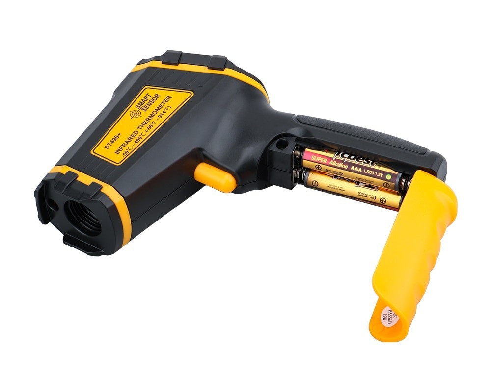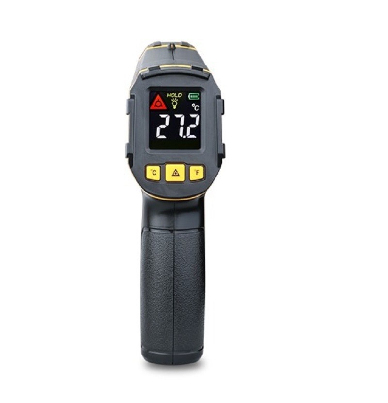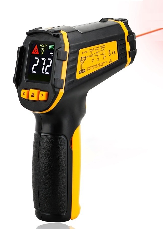 Infraröd termometer utan kontakt. Utrustad med laserpekar. Mäter temperaturen på avstånd med noggrannhet på +- 1°C. Kan mäta i intervallet - 50°C till 390°C Snabbt resultat på endast 0,5 s. Optiskt förhållande 12:1. Har ett internt minne där de uppmätta värdena lagras. Saknar inte funktionen för automatisk avstängning eller funktionen för att växla mellan °C och °F. Drivs av 2 AAA-batterier.