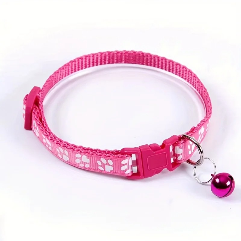 Säker och justerbar kattkrage med tassavtryck och bjällra. Hållbart material, lämplig för daglig användning. Fullständig beskrivning