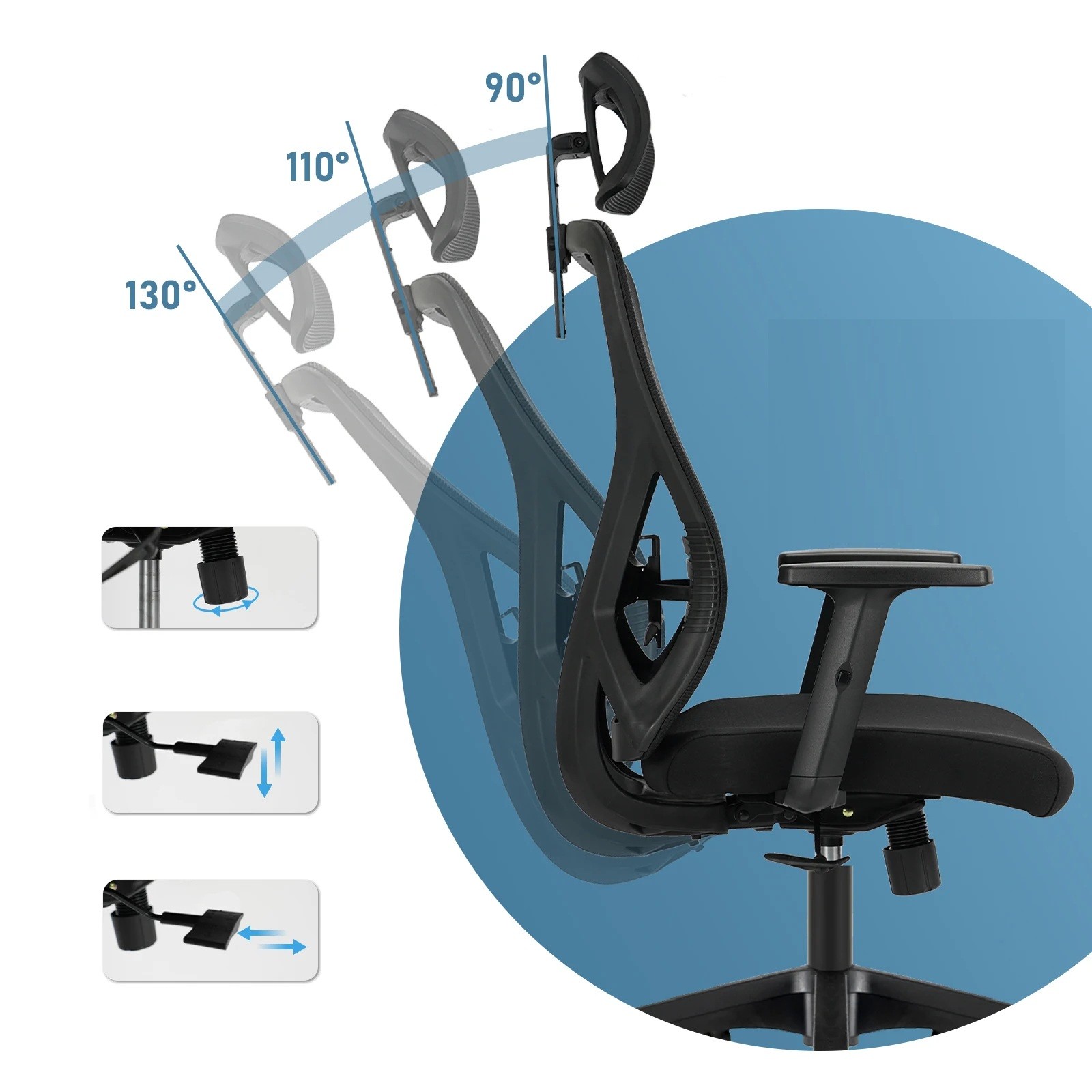 • Gungmekanism med lutning av ryggstödet 90–130° och justerbart motstånd