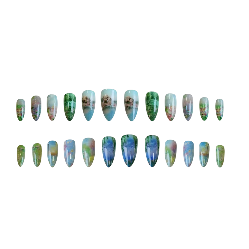 Glänsande falska naglar med mandelform och lekfulla mönster möjliggör snabb manikyr, bekväm bärbarhet och enkel justering av längd. Fullständig beskrivning