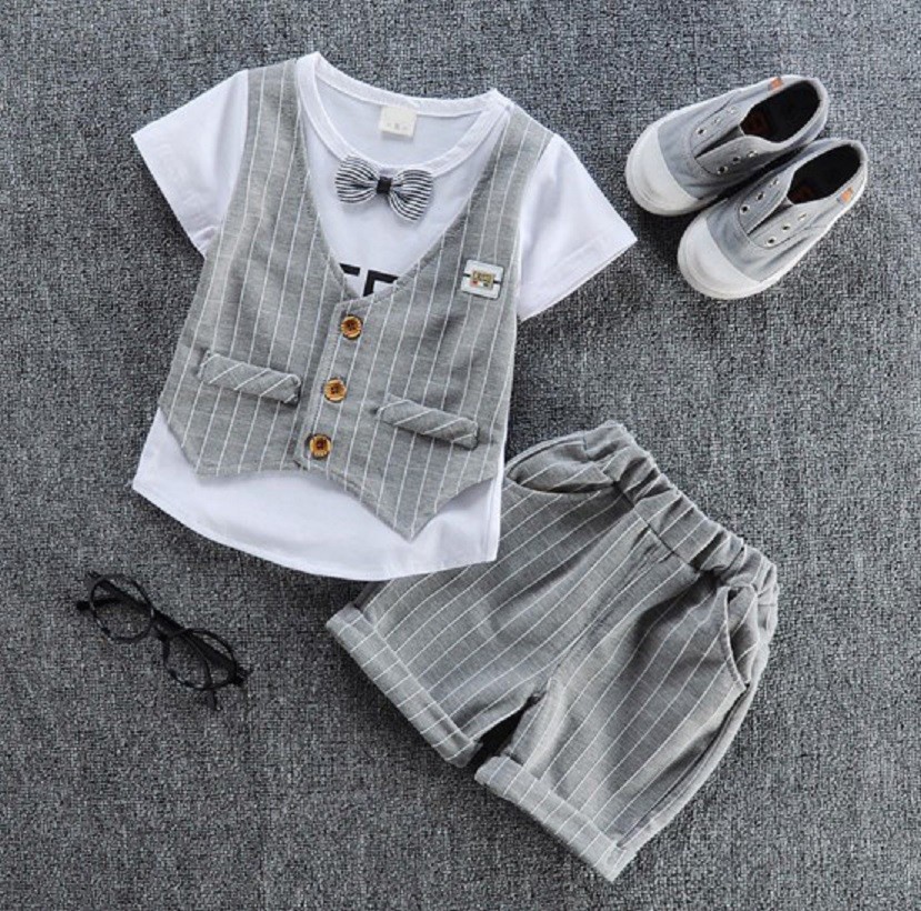 Detta set innehåller en T-shirt med kostym och fluga tryck och shorts.