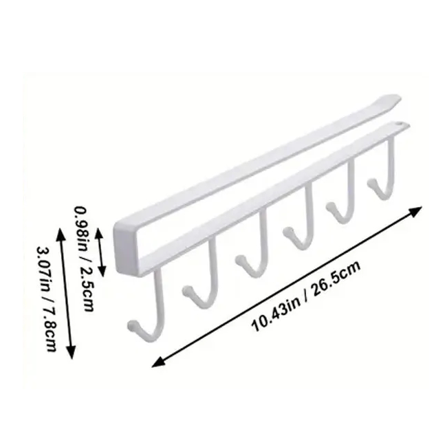 Den hängande klädhängaren med krokar är en praktisk organiserare avsedd för att utnyttja utrymmet under hyllan eller i skåpet. Konstruktionen möjliggör upphängning av olika föremål i en rad, så att de är tydligt synliga och lättillgängliga. Detta kan hjälpa till att hålla ordning i köket, garderoben eller andra förvaringsutrymmen.