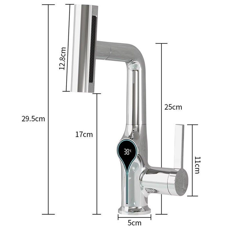 Denna moderna tvättställskran med digital skärm är utrustad med en temperaturindikator som visar den aktuella vattentemperaturen, vilket ger perfekt komfort och säkerhet vid användning. Tack vare den digitala skärmen har du alltid koll på temperaturen, vilket eliminerar risken för brännskador eller för kallt vatten. Kranen har måtten 29,5 cm, vilket är en ideal storlek för de flesta badrumstvättställ. Den är designad för varmt och kallt vatten och tillför en stilren design till varje badrum. Den digitala skärmen är inte bara en praktisk funktion, utan också ett estetiskt inslag som kompletterar det moderna utseendet i ditt badrum.