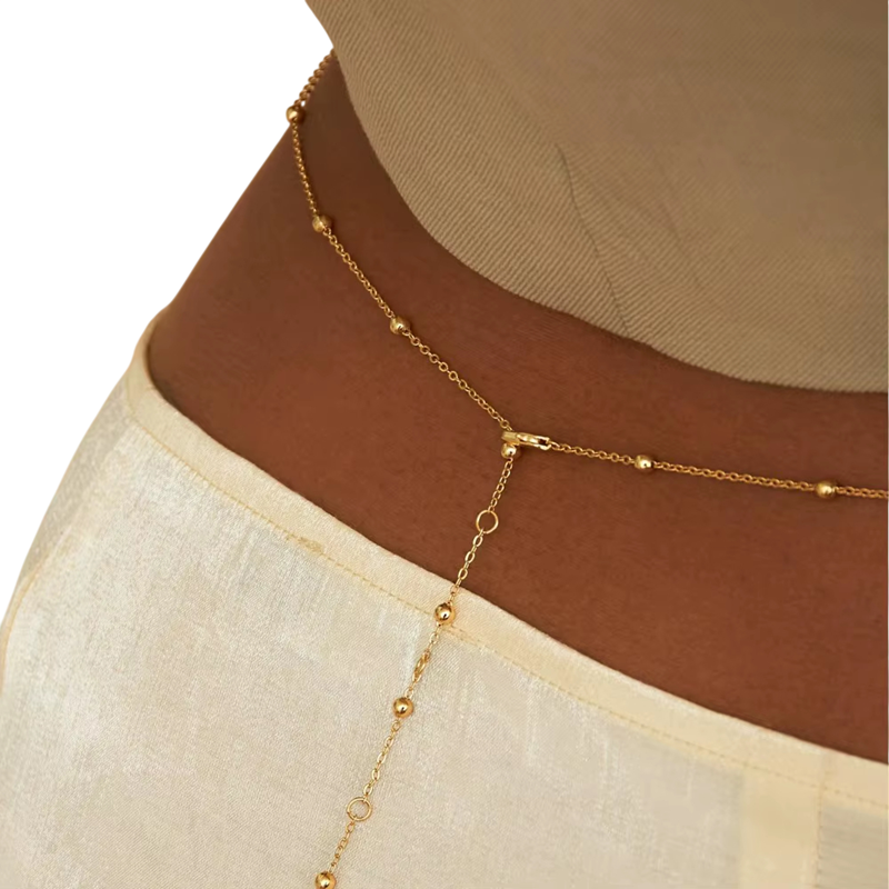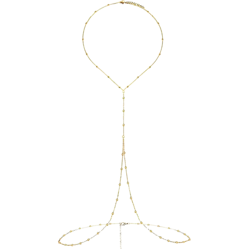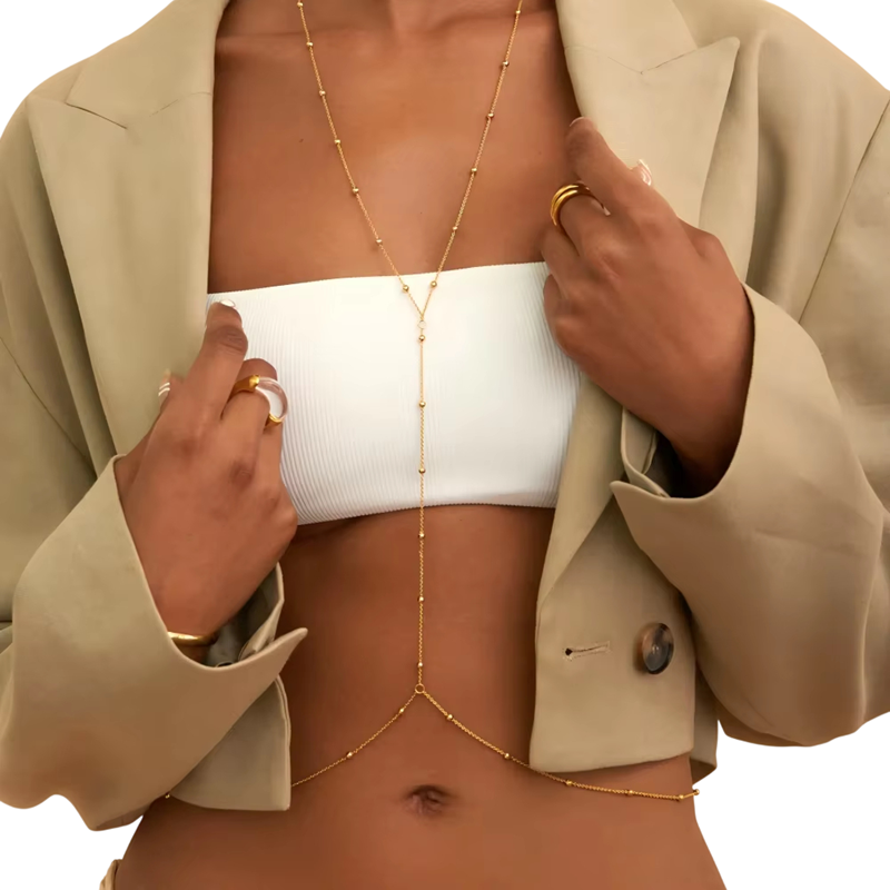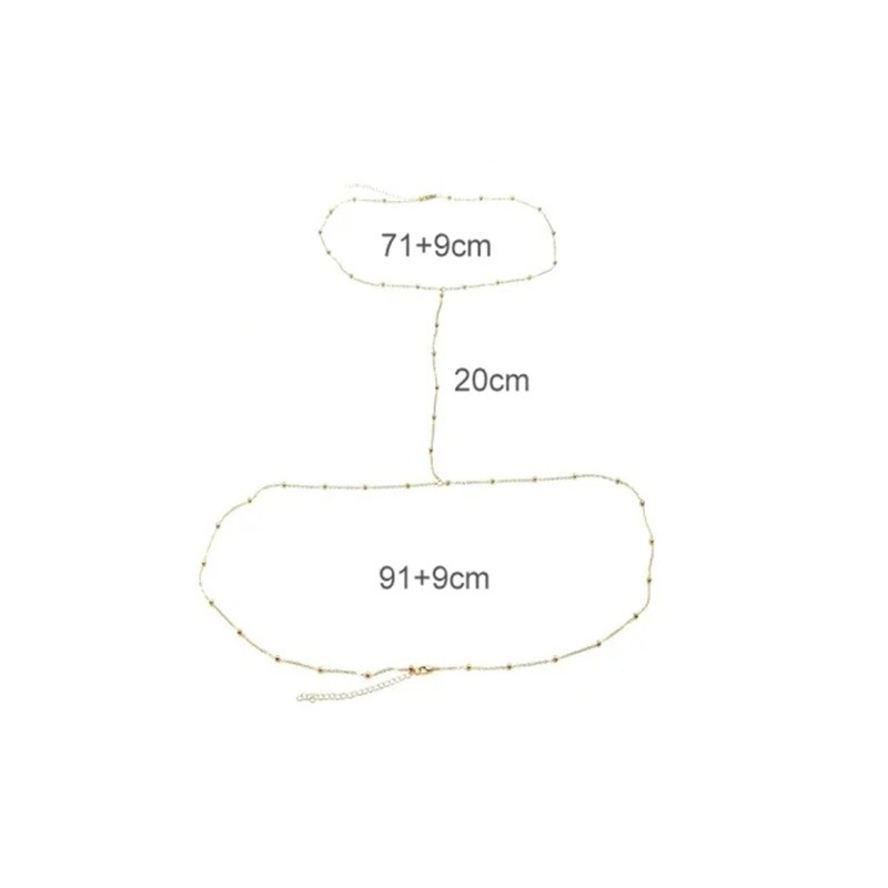 Detta sexiga kroppshalsband med pärlor är en framträdande modeaccessoar som kopplar samman området kring nacke och midja till en elegant helhet. Tack vare den genomtänkta konstruktionen skapar det en visuellt tilltalande linje som framhäver den kvinnliga silhuetten och ger outfiten en självsäker sommarkaraktär. Magkedjan med en längd av 91 + 9 cm anpassar sig bekvämt efter kroppen, medan halskedjan med en längd av 71 + 9 cm säkerställer en stabil och stilfull fästning. Den kopplande kedjan mellan nacke och mage med en längd av 20 cm skapar en unik kopplingseffekt och ger smycket ett originellt utseende. Detta vattentåliga och minimalistiska kroppssmycke är det perfekta valet till bikinit, på stranden, festivaler och sommarfester.