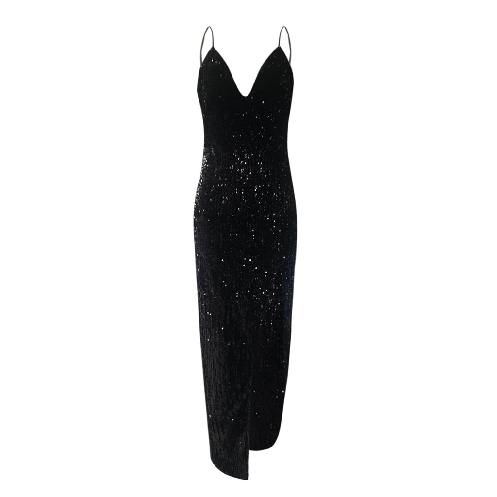 Lyxig lång aftonklänning med paljetter och hög slits.
