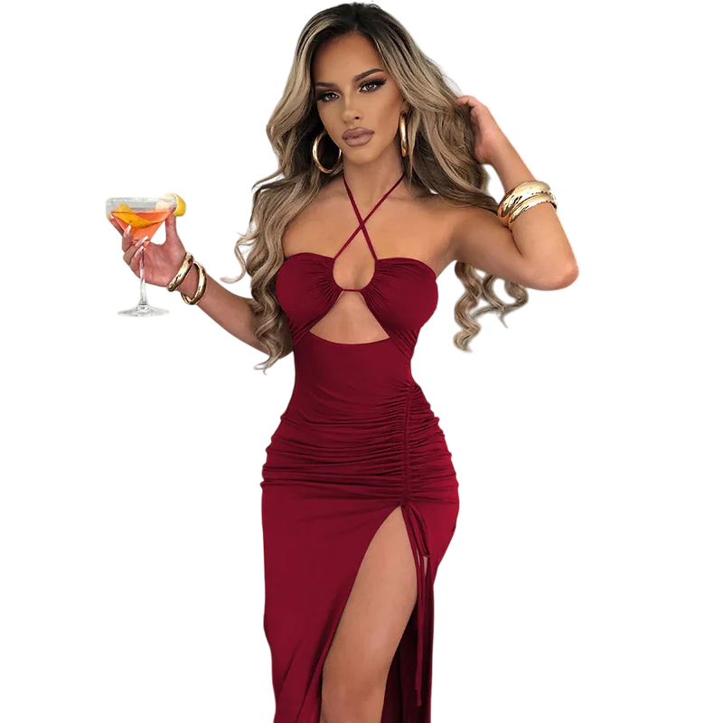 Elegant figursydd klänning med djup urringning, ruchning, hög slits och knytband i nacken, perfekt för sociala tillfällen. Fullständig beskrivning