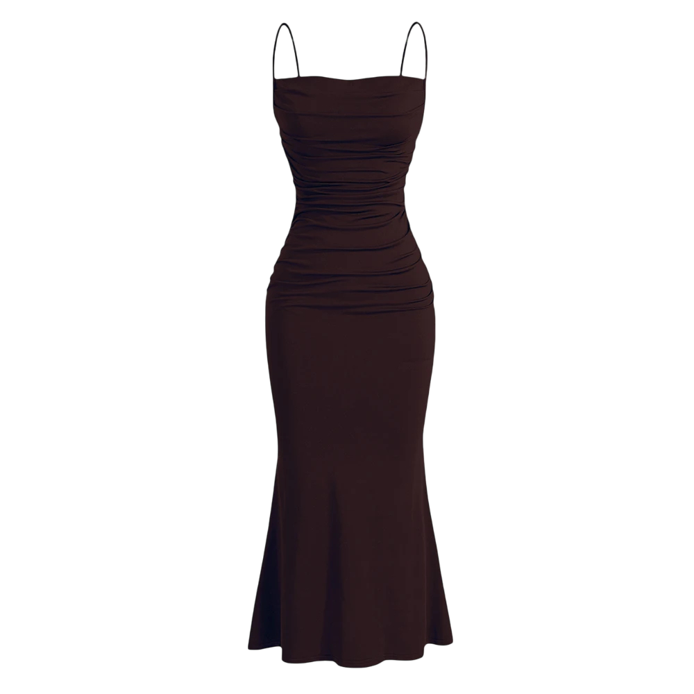 Lång formell klänning med tunna axelband, veckat livstycke, elastiskt material, utsvängd fåll, passform, elegant stil