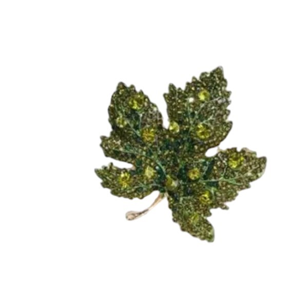 Den noggranna bearbetningen av bladlinjerna framhäver formen av lönnbladet och betonar dess dekorativa karaktär. Tack vare den heltäckande prydnaden av stenar ger broschen ett rikt och representativt intryck. Den passar utmärkt till kappa, kavaj, klänning och elegant tröja, där den blir ett dominerande inslag i outfiten. Den kommer att sticka ut vid sociala tillställningar, festliga evenemang och vid stilfullt vardagsbruk. Tack vare det tidlösa växtmotivet följer den inte kortvariga trender.