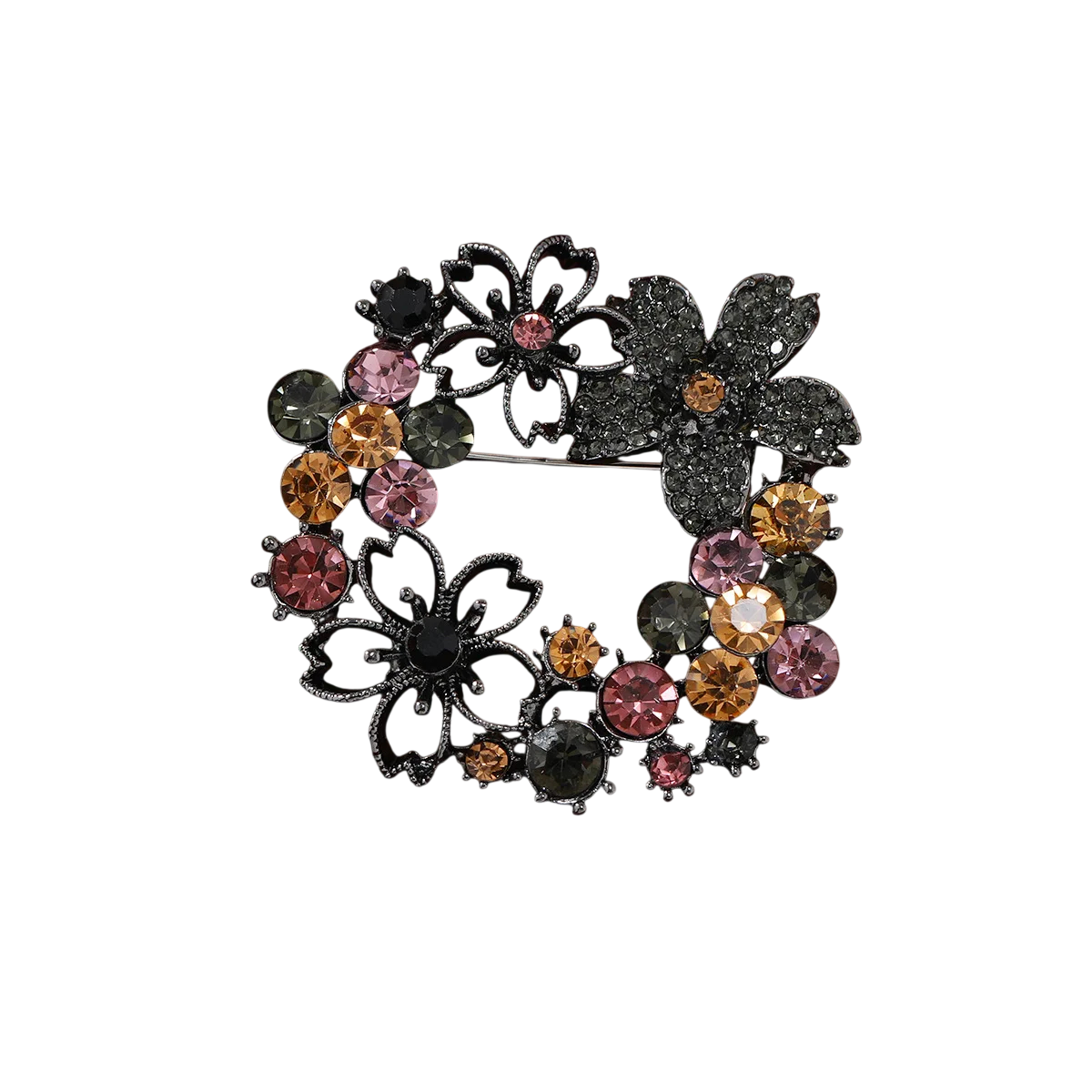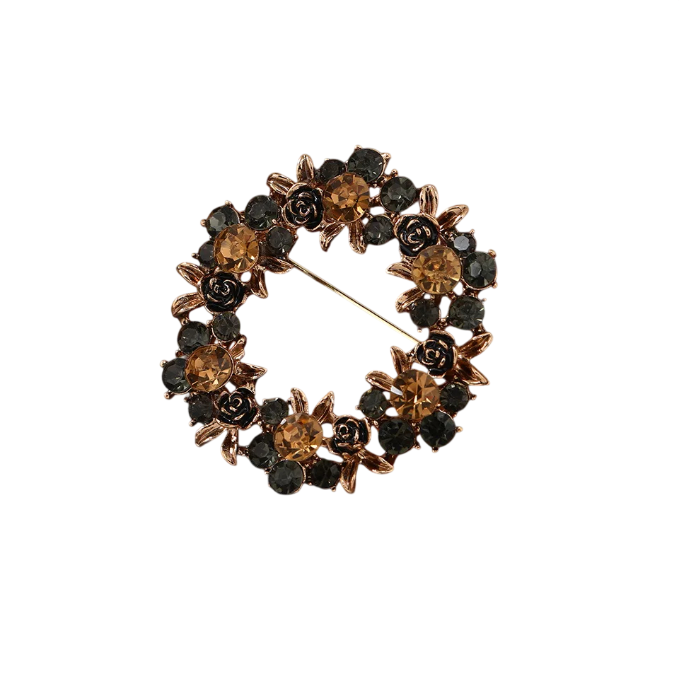 Lyxig mörk brosch Rund krans med stenar av blommor och blad Höstfärger svart vinröd guld Zinklegering