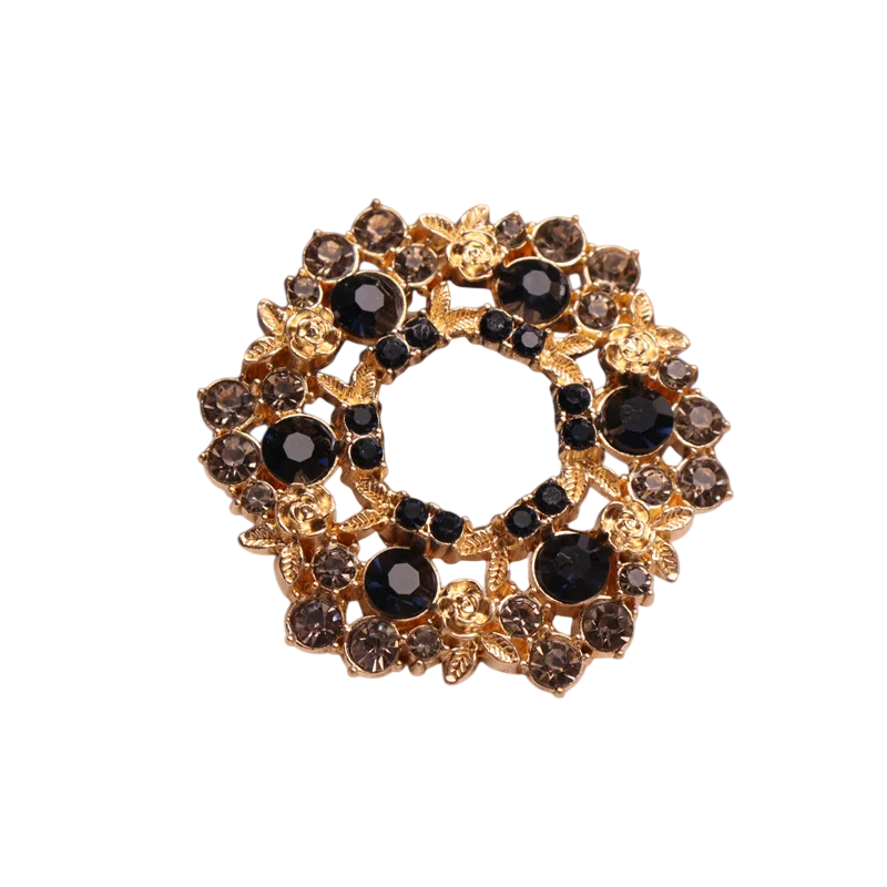 Lyxig mörk brosch Rund krans med stenar av blommor och blad Höstfärger svart vinröd guld Zinklegering Denna lyxiga mörka brosch är designad i en subtil rund form som påminner om en krans av blommor och blad. Stenarna är infattade i dämpade höstfärger som ger en harmonisk och elegant känsla. Färgkombinationen av svart, vinröd och guld skapar en diskret helhet som passar för höst- och kvällsoutfits. Den metalliska basen av zinklegering säkerställer styrka och stabil form vid användning. Broschen är det perfekta valet för dem som föredrar smakfulla och diskreta accessoarer.