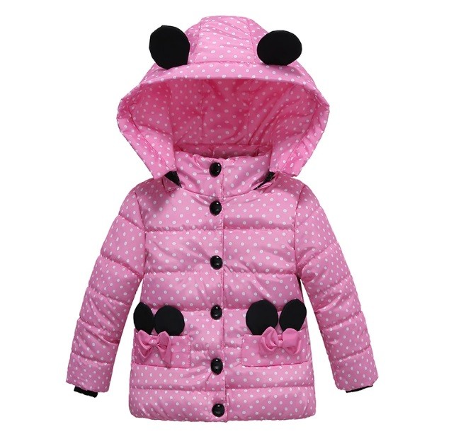 En mycket fashionabel vinterjacka med prickar och rosetter kommer inte bara att charma din lilla flicka, utan kommer också att hålla henne varm.