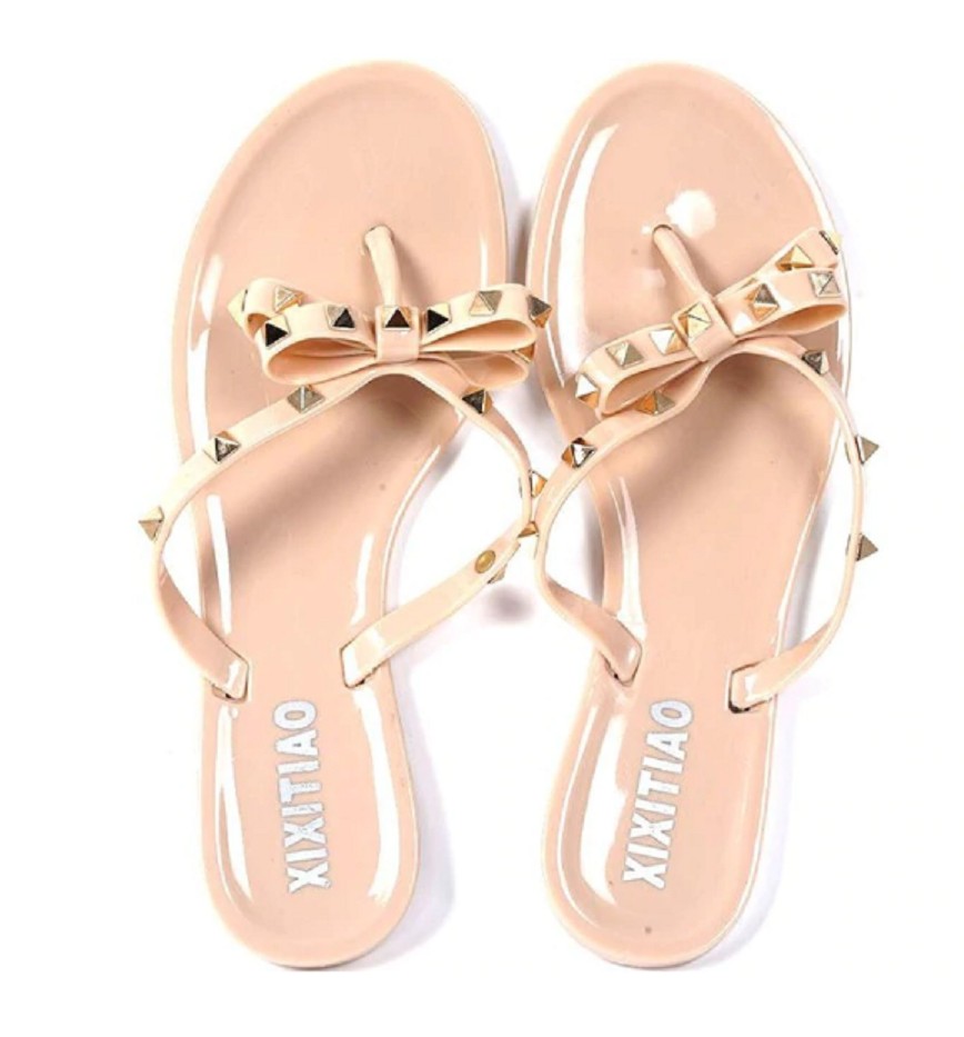 Flipflopsna är dekorerade med en rosett med nitar.