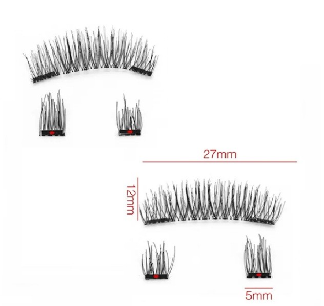 De huvudsakliga fransbanden har måtten 12 x 27 mm, vilket säkerställer ideal längd och täthet för naturlig framhävning av ögonen. Stabiliteten vid bärning stöds av magnetiska segment på 5 mm, som sitter stadigt på plats utan att glida. Fransarna är designade för att se naturliga ut vid daglig sminkning, men ger också tillräcklig volym för kvällsmakeup. Tack vare högkvalitativt utförande är de återanvändbara, vilket gör dem till ett praktiskt och ekonomiskt val.
