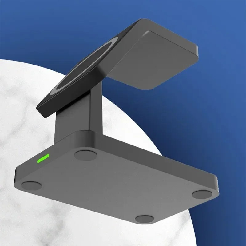Skrivbordets magnetiska laddningsstation möjliggör samtidig trådlös laddning av telefon, smartklockor och hörlurar på ett ställe. Fullständig beskrivning