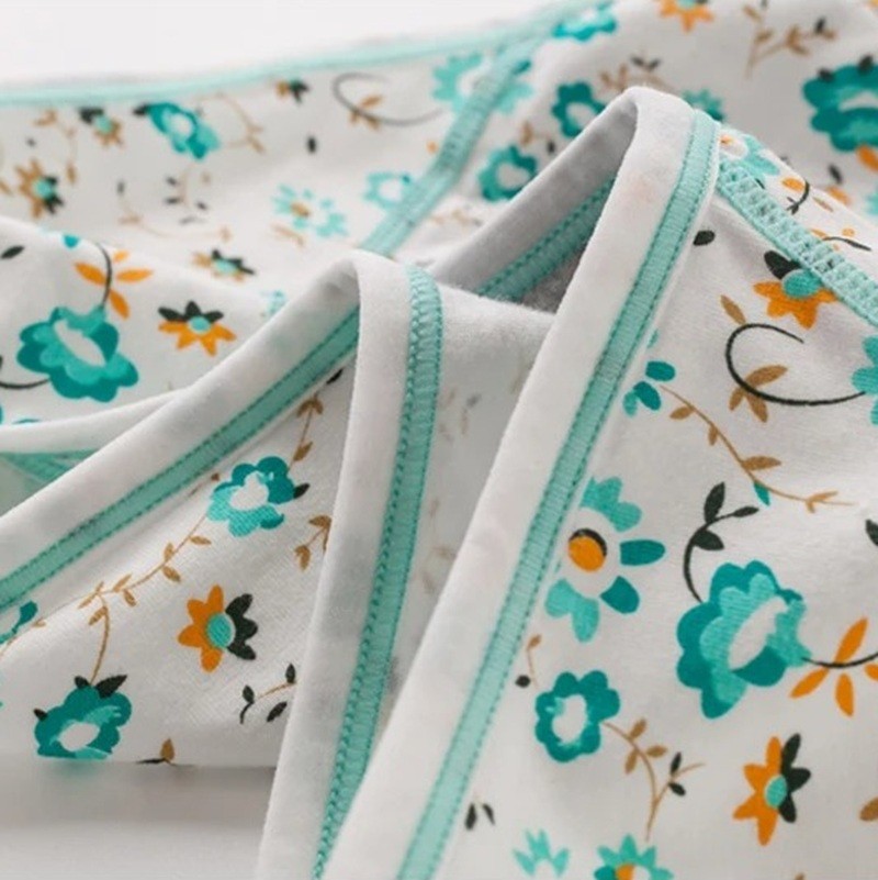 Materialet består av bomull och elastan, vilket säkerställer en kombination av naturfiber och elasticitet. Tack vare detta anpassar sig underkläderna efter kroppens form och behåller samtidigt den mjukhet som är typisk för bomullstextilier. Ytan på underkläderna pryds av blommönster som är synligt på en ljus bakgrund.