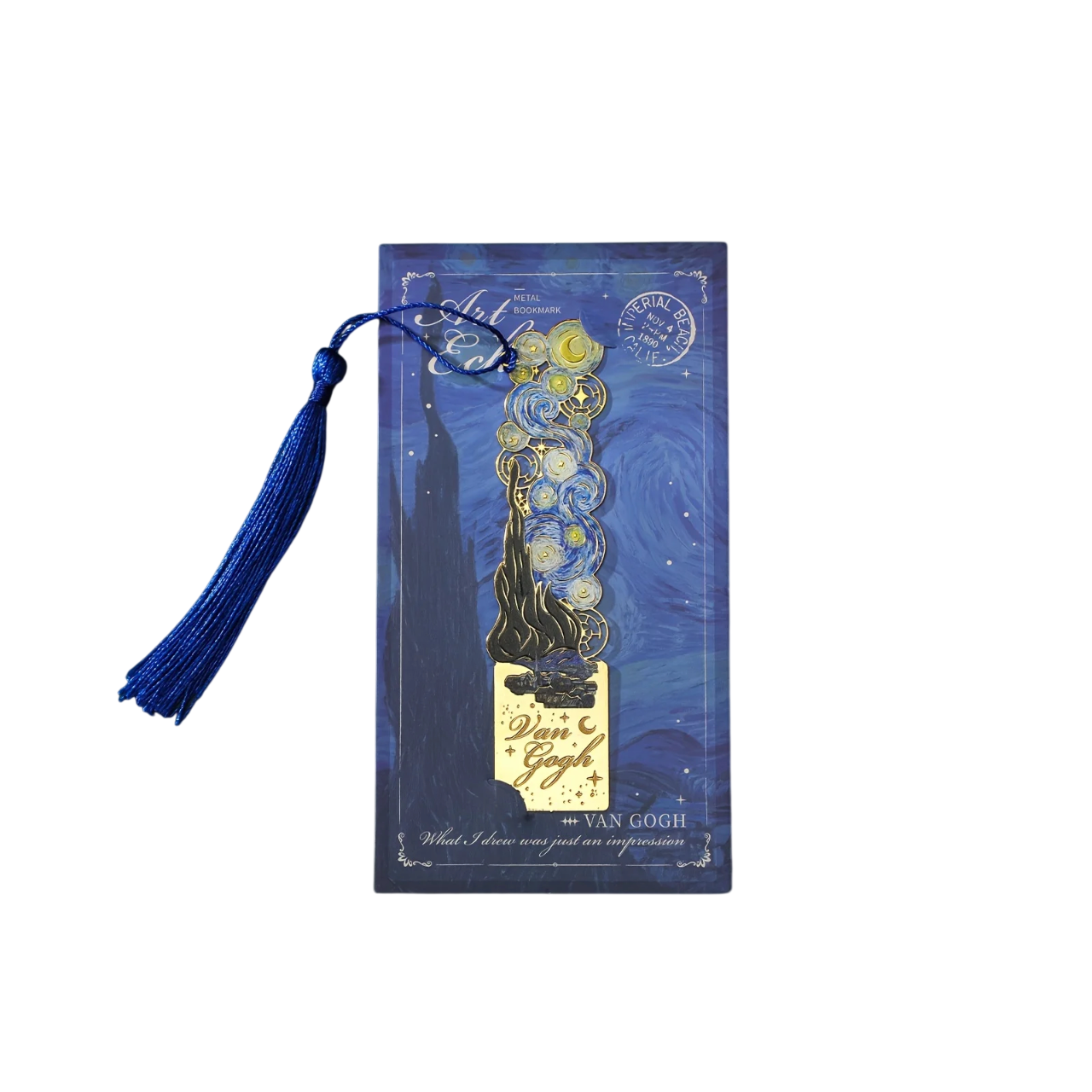Metallbokmärke med motiv inspirerat av Vincent van Goghs verk Stjärnkvällen 14 x 7,5 cm Metallbokmärket med motiv inspirerat av den berömda målningen Stjärnkvällen är en elegant accessoar för varje läsare som har en passion för konst. Det förenar praktisk funktion med ett starkt visuellt intryck och ger en estetisk upplevelse till läsningen. Den noggranna utförandet av motivet skapar en dekorativ detalj som fångar ögat vid första anblicken. Tack vare den robusta metallkonstruktionen känns bokmärket stabilt och representativt. Det passar både för daglig användning och som en stilfull present.