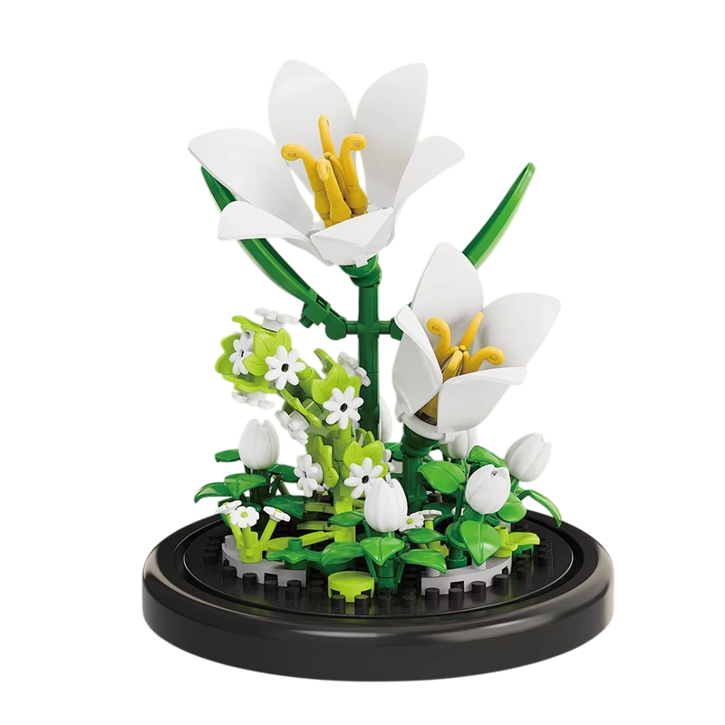 • 161 st mikro byggblock för att bygga en realistisk lilja i kruka.