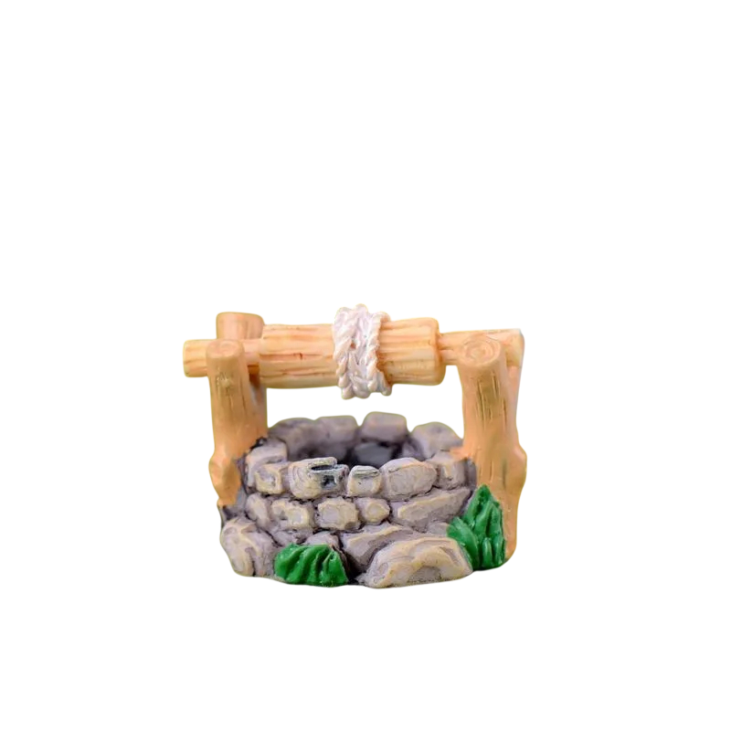Dekorationen är tillverkad av harts, vilket möjliggör bevarande av fina detaljer och realistisk struktur av materialet. Ytan på brunnen imiterar stenmur och kompletterande träelement i konstruktionen. Dimensioner cirka 3,9 × 2,8 cm möjliggör enkel integrering i mindre modellscenarier och mini trädgårdar.