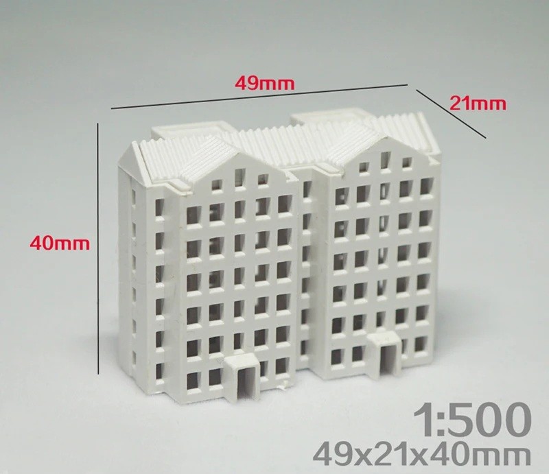 Detaljerad modell av en flerfamiljshus i skala 1:500. Levereras som en byggsats av ABS-plast för montering. Fullständig beskrivning