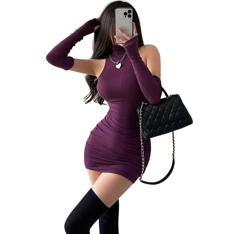 Startsida Startsida Kläder och accessoarer Damkläder Damklänningar Damsommarklänningar Miniklänning med hög krage och exponerade axlar Separata långa ärmar Sexig bodycon cut Elegant aftonklänning Elastiskt material