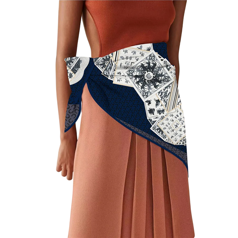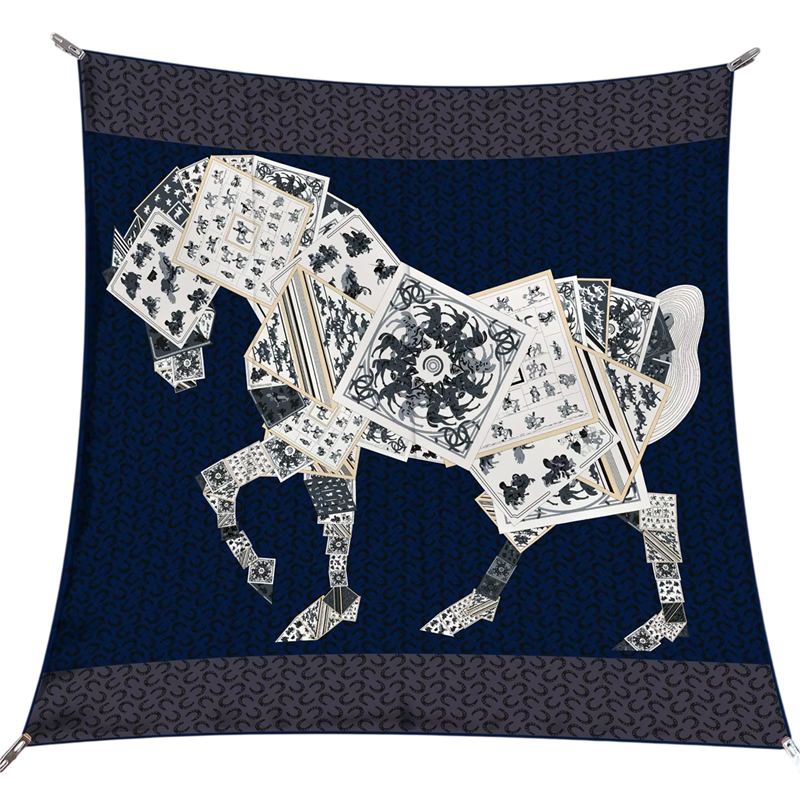 Denna fyrkantiga scarf förenar elegans med konstnärligt uttryck. Den dominerande mosaikmotiv av häst skapar en visuellt tilltalande effekt som omedelbart drar uppmärksamhet. Designen kopplar samman moderna modetrender med tidlösa symboler för styrka och frihet. Tack vare sin mångsidiga form kan du bära den som scarf för huvud, hals och kropp, vilket enkelt förvandlar varje outfit. Den är det perfekta valet för kvinnor som söker en iögonfallande men samtidigt sofistikerad accessoar.