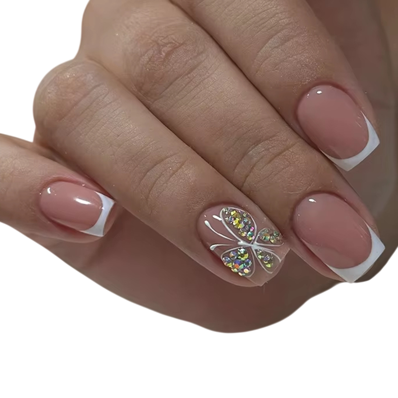 Detta unika set av konstgjorda naglar är designat för kvinnor och flickor som vill kombinera elegant fransk stil med en subtil dekorativ detalj. Den fyrkantiga formen med heltäckning ger ett modernt, rent och mycket välvårdat intryck, vilket säkerställer ett professionellt utseende som från salong. Akrylutförandet ger naglarna styrka och samtidigt lätthet, vilket gör dem bekväma även vid heldagsbärande. Det nalepningsbara systemet möjliggör snabb och enkel applicering som även nybörjare kan hantera utan problem. Fjärilsdekoren tillför manikyren en feminin och romantisk karaktär som framhävs vid vardagligt bruk såväl som vid speciella tillfällen.