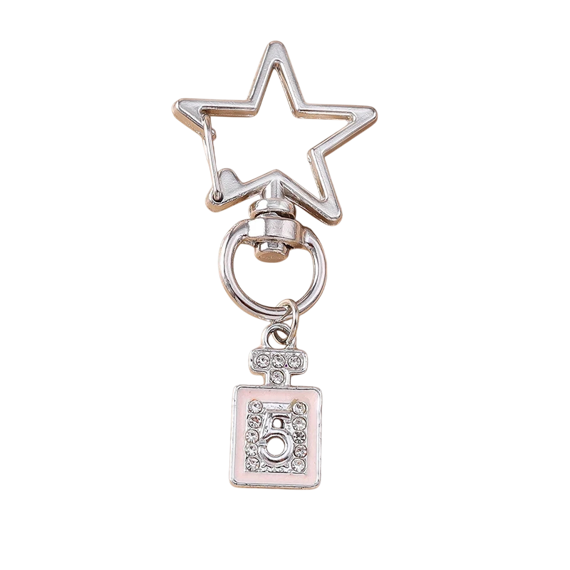 Stilren metallnyckelring i hållbar legering med motiv av parfymflaska och stjärna. Elegant accessoar för nycklar, handväska och ryggsäck. Fullständig beskrivning
