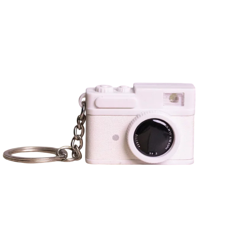 Nyckelringen är tillverkad av en kombination av plast och metall, vilket säkerställer hållbarhet och motståndskraft vid daglig användning. Vid tryck på knappen aktiveras ljusblixten och det autentiska ljudet av fotografering, vilket ger hela accessoaren en lekfull karaktär. Denna lilla gadget kommer att glädja fotointresserade, barn och vuxna som uppskattar originella och unika accessoarer.
