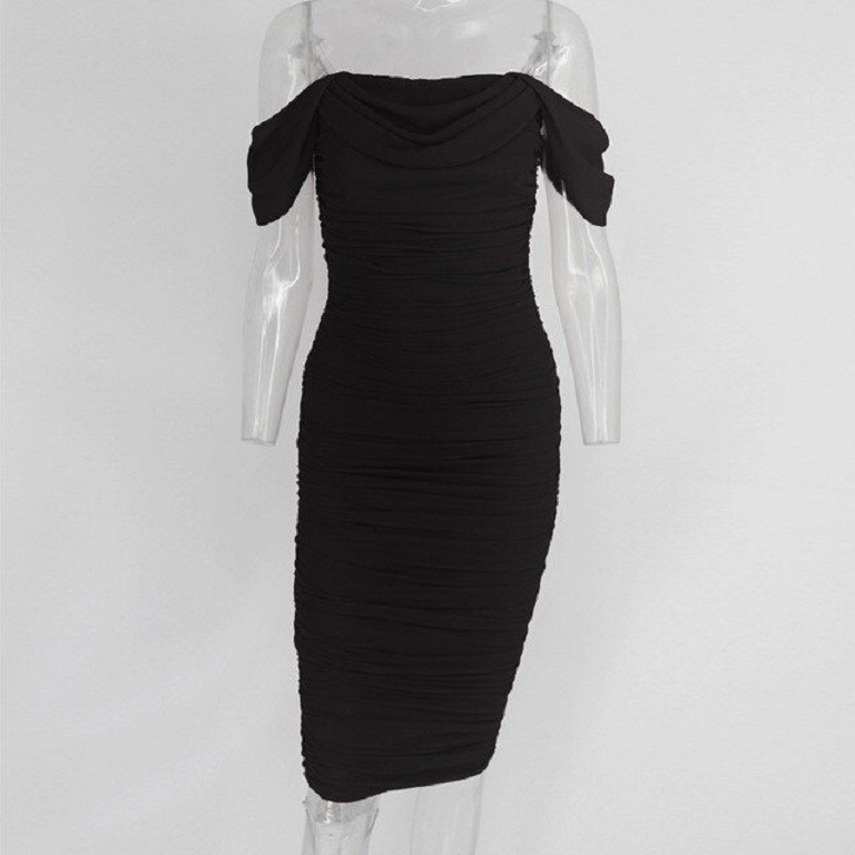 Elegant cocktailklänning för kvinnor med tappade axlar.