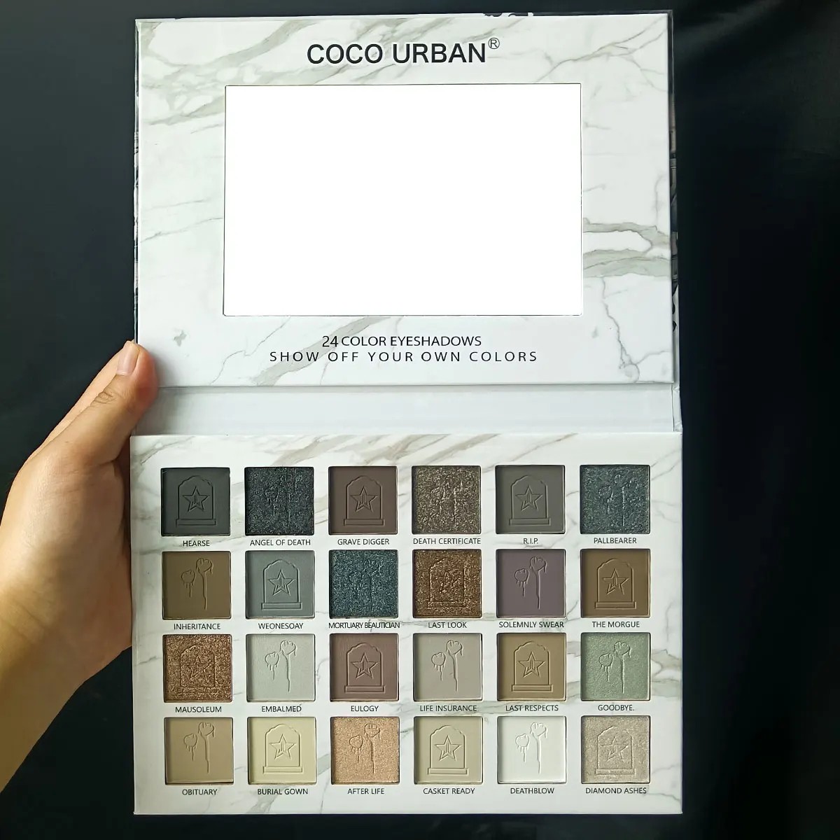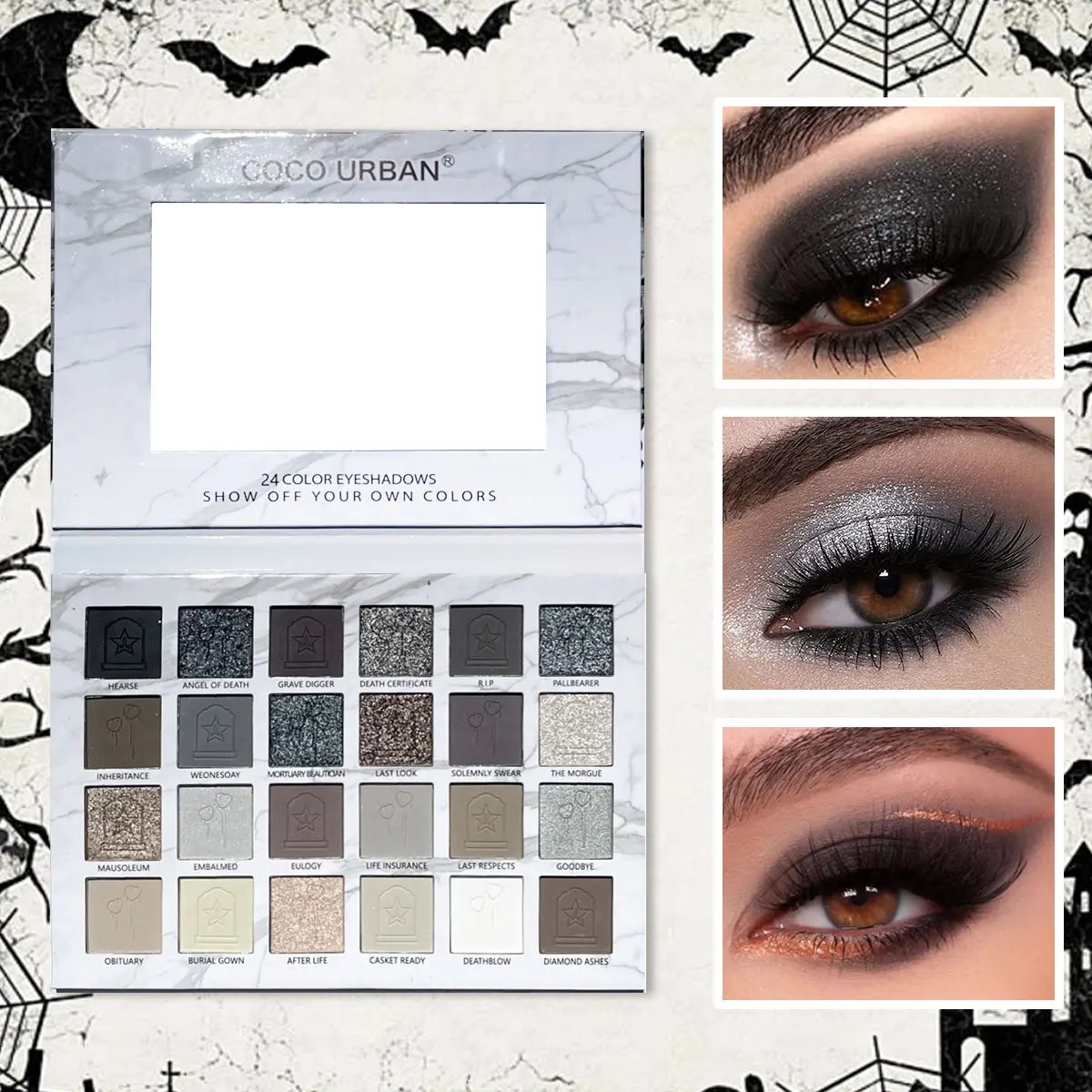 Palett med 24 mörka matta och glittriga nyanser för dramatisk rökig sminkning, punk stil och uttrycksfull Halloween-makeup. Fullständig beskrivning