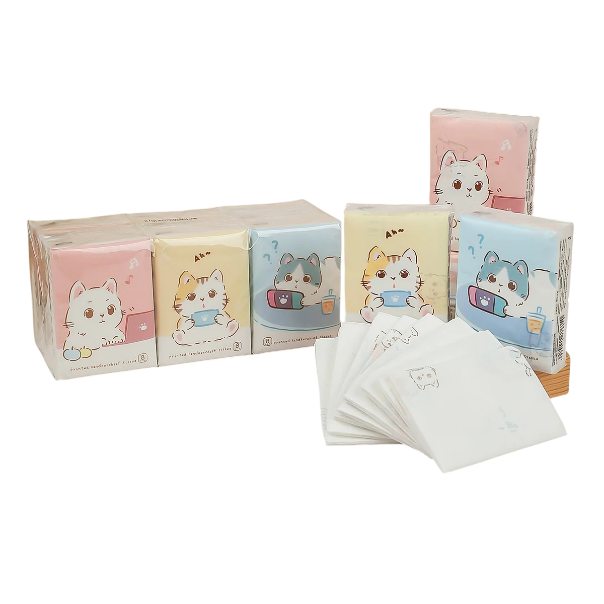 Söta oparfymerade näsdukar med kattmotiv. Förpackning 8 st × 9, mjuka och lämpliga för daglig hygien. Fullständig beskrivning