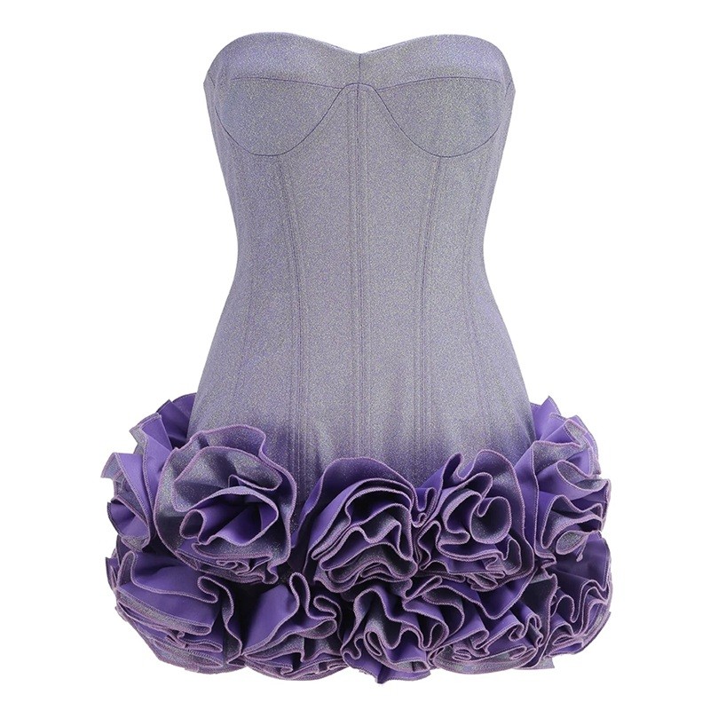Denna statement miniklänning kombinerar en glamorös design med djärva detaljer som väcker uppmärksamhet. Den axelbandslösa korsettkroppen kramar hårt om figuren, framhäver midjan och skapar en feminin siluett. Den bakre delen kompletteras med snörning, vilket ger inte bara en visuell effekt, utan också möjligheten till en idealisk midjaform. Nederdelen består av en rikt lager kjol med dramatiska volanger som ger klänningen volym, struktur och en distinkt look. Denna modell är idealisk för kvällsevenemang, fester och glamorösa fester där du verkligen vill glänsa.