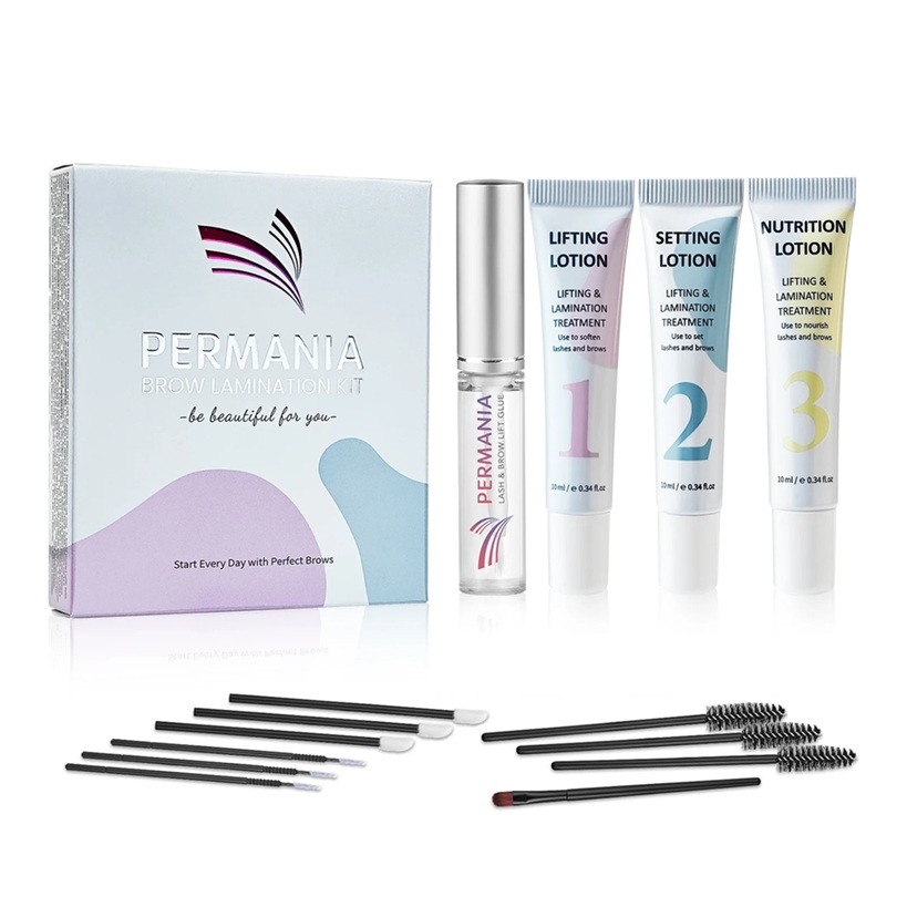 PERMANIA set för laminering av fransar och ögonbryn 3x10 ml Professionell lash lift och brow lamination permanent vård fixering lockning näring fransar