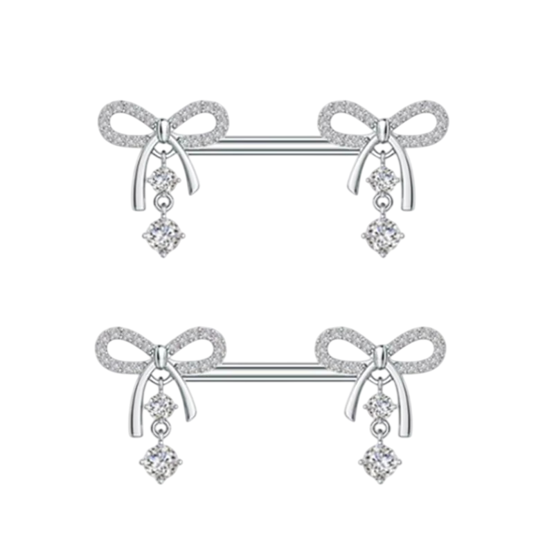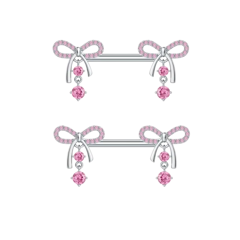 Glänsande par av bröstvårtepiercingar med rosettmotiv erbjuder subtil elegans, kvinnlig stil och en framträdande detalj för ett självsäkert utseende. Fullständig beskrivning