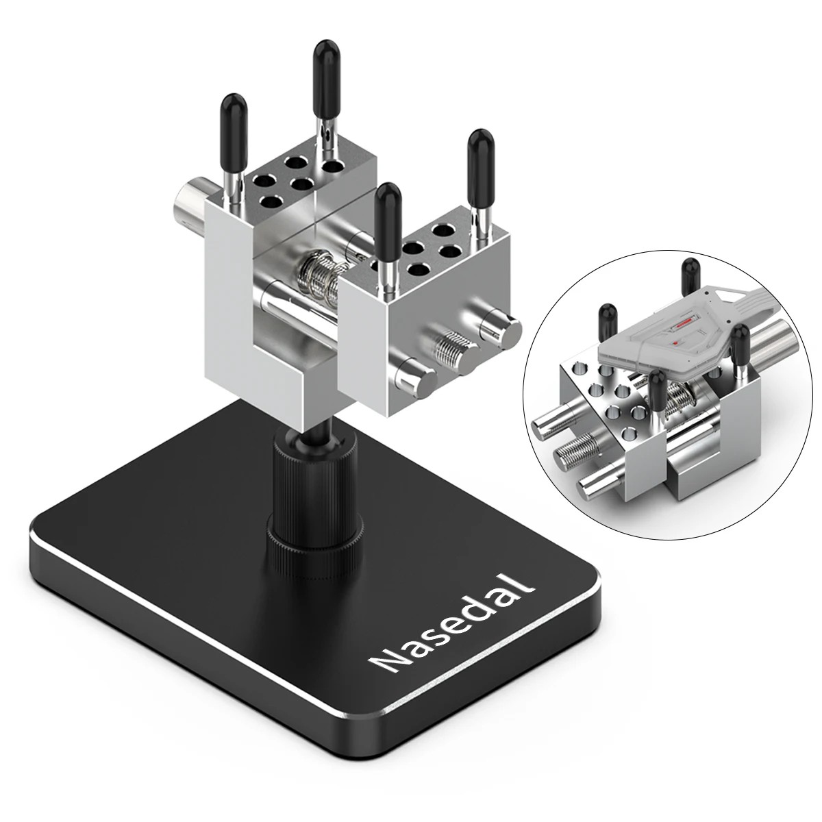 Fastsättningsblocken är utrustade med flera hål för individuella fastsättningsstift, som kan placeras fritt beroende på formen och storleken av den fastsatta delen. Tack vare detta kan man säkert fixera inte bara regelbundna former, utan även oregelbundna eller cylindriska komponenter utan risk för skador. Den fina gängan och det smidiga arbetet av kontrollratten möjliggör exakt inställning av trycket.
