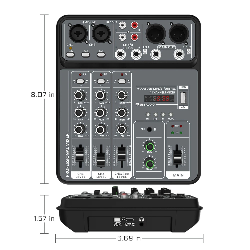 Denna professionella 4-kanals mixer är den perfekta lösningen för hemmastudio, live-sändningar, karaoke, podcasts och små konserter. Den erbjuder kompakta mått 20,5 × 17 × 4 cm och ger ändå alla funktioner som både nybörjare och avancerade ljudtekniker behöver. Mixern är utrustad med fyra oberoende ingångar som möjliggör anslutning av mikrofoner, musikinstrument, datorer eller andra ljudkällor.