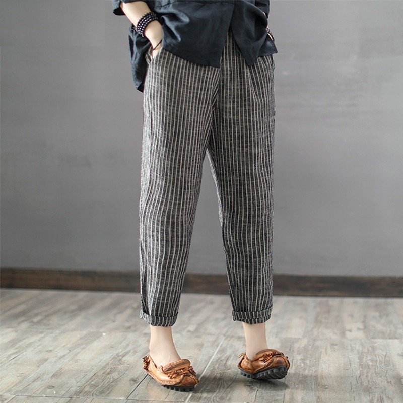 Randiga byxor för kvinnor med resår i midjan