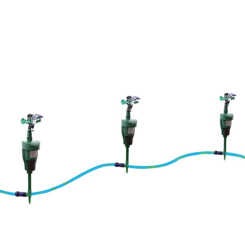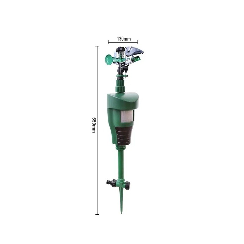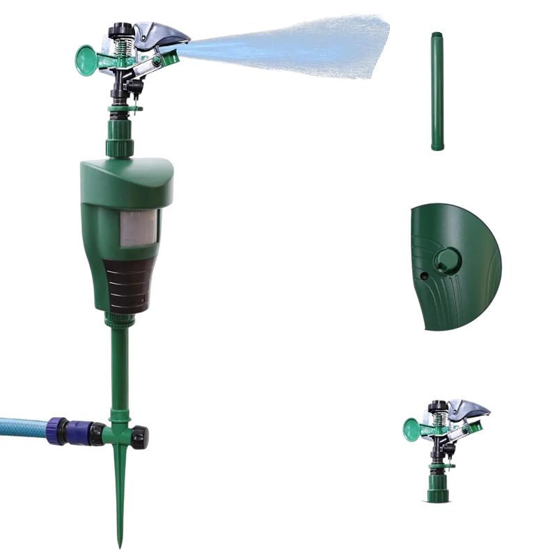 Enheten är utformad för att aktivera vattensprutning efter att rörelse har registrerats. Sprayaren sprutar vatten åt alla håll, vilket täcker ett större område och reagerar på rörelse i närheten av enheten.