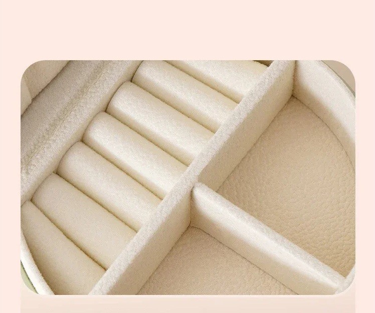 Den inre arrangemanget möjliggör separation av olika typer av smycken så att de är överskådligt lagrade. Hållarna i locket är lämpliga för kedjor eller halsband, medan rullarna möjliggör säker förvaring av ringar. Separata fack kan användas för små tillbehör, örhängen eller hängen. Den stängbara lådan hjälper också till att skydda innehållet mot damm.
