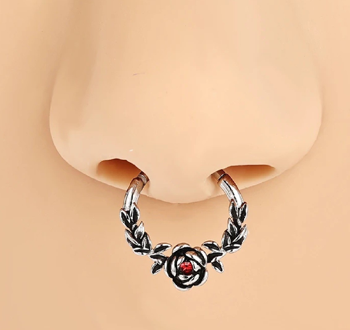 Silverfärgen i kombination med mörka accenter framhäver formen och det ornamentala utförandet. Den runda formen ger en harmonisk och universell känsla, vilket möjliggör bred användning för olika typer av piercingar. Ytan är slät och visuellt ren, vilket gör att smycket passar både i en minimalistisk och en mer framträdande stil. Rosen med blad ger smycket en symbolisk och estetisk dimension. Den övergripande designen är balanserad och tidlös.
