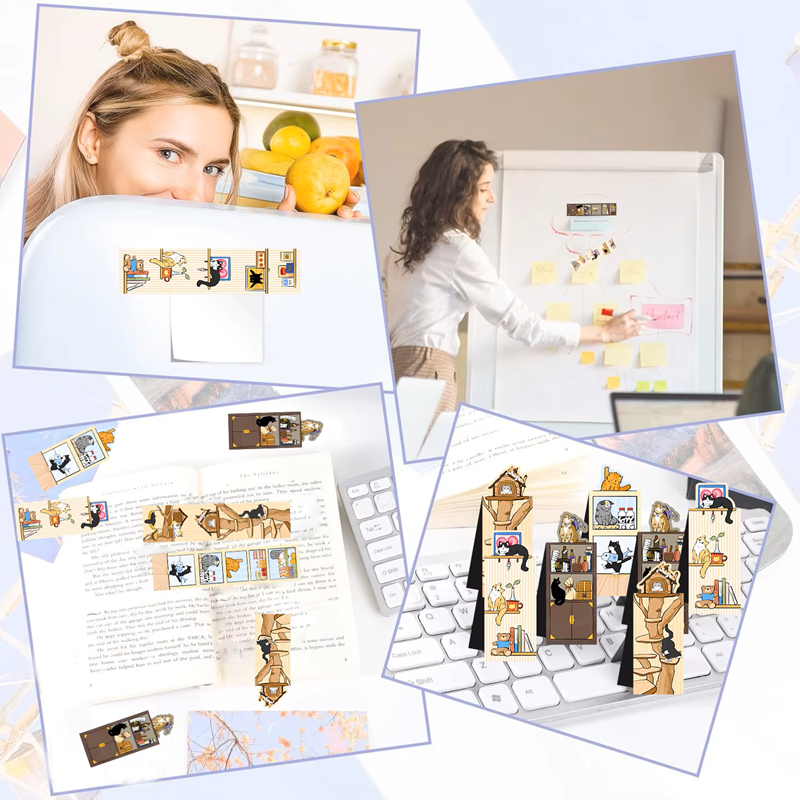 Illustrativ sats med magnetiska bokmärken med kattmotiv och bibliotekstema för böcker, kalendrar och anteckningsböcker. Fullständig beskrivning